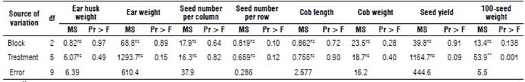 Due to the size of the plot, which was 3x3 m2, there were four planting lines at a distance of 75 cm in each plot. At the time of harvest (August 29, 2014), three plants were randomly selected from the two middle lines of the plot and the desired ears were harvested. The selection criteria were plants that represented the plot. Sampling was not performed from the two side lines of the plot to remove the margin effect. After drying the ears, the ear husks were first separated from the ears and the ear husks were weighed. Each ear was then weighed without husk. Seed numbers per column and row of ear, length and weight of cobs, seed yield, and weights per 100 seeds were determined.