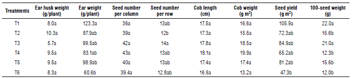 a T1, T2, T3, T4, T5, and T6 are control (intact plant), removal of leaves above the ear, removal of leaves below the ear, removal of all leaves, detopping (removal of stem above the ear), and detopping plus removal of leaves below the ear, respectively. b Means followed by a different lowercase letter in the column are different at a 5% probability level by the Duncan test.