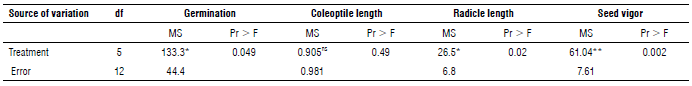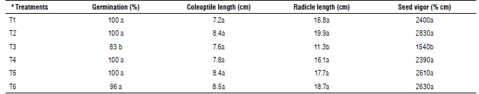 One week after the seed germination test, seed germination percentages, coleoptile and radicle lengths, and seed vigor were measured. Two millimeters of coleoptile growth was the germination criterion. The seed vigor estimate was calculated by multiplying the germination percentage by the seedling length (coleoptile length plus radicle length) (Heidari, 2013).