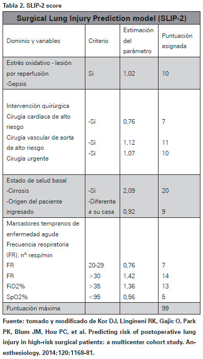 En el sentido expresado en el párrafo anterior se han desarrollado algunos índices que permiten predecir hasta cierto punto la aparición de lesión pulmonar y por tanto, al aplicarlos determinar la utilidad del uso de VPP en los pacientes mas susceptibles. Canet et al, basándose en un estudio de cohortes, identificaron un índice para prevenir la posibilidad de aparición de complicaciones pulmonares postoperatorias que se ha denominado índice ARISCAT (Ver Tabla 1), relacionándose además con la mortalidad postoperatoria44. En 2014 se ha actualizado otra escala de riesgo, la SLIP-2, que relaciona determinados predictores con la posibilidad de desarrollo de lesiones pulmonares postoperatorias con mayor capacidad de predicción que la anterior45 SLIP-1 (Ver Tabla 2). Se identificaron nueve predictores independientes de SDRA: sepsis, cirugía vascular aórtica de alto riesgo, cirugía cardiaca urgente de alto riesgo, cirugía urgente, cirrosis, ingreso desde ubicación diferente al domicilio del paciente, frecuencia respiratoria aumentada (20 a 29 y >30 respiraciones/min), FiO2 mayor de 35%, y saturación de oxígeno menor de 95%45. La utilización de estas escalas orientaría al médico cuando se enfrentara a un caso en el que la utilización de VPP es muy recomendable para reducir de forma importante la incidencia de lesiones pulmonares intra y postoperatorias.