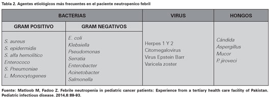 El aislamiento del germen es importante para definir un manejo dirigido y obtener mejores respuestas a la terapéutica instaurada; no obstante, en la mayoría de los casos solo se puede aislar el agente etiológico responsable en el 10% al 30% de los casos2,7, cifra que aumenta hasta el 40% en pacientes que además cursan con sepsis al usar métodos de aislamiento convencional como los cultivos. En la Tabla 2 se especifican los patógenos más frecuentes según el tipo de organismo. Dentro de los gérmenes detectados con mayor frecuencia en pacientes con neutropenia febril de alto riesgo estan S. aureus, E. faecalis, S. pneumoniae, S. pyogenes, E. coli, Klebsiella pneumoniae, Acinetobacter y P. aeruginosa5,20,21, esta última se ha reportado hasta en un 5% de los casos en niños.