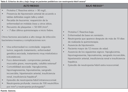 La neutropenia febril en el paciente pediátrico con enfermedad oncológica puede causar una alta morbimortalidad. La mayoría de las veces la fiebre en el paciente neutropénico febril obedece a una infección principalmente bacteriana aunque son diversos microorganismos los que pueden estar implicados. Se deben realizar estudios locales dirigidos a describir los tipos de patógenos, patrones de resistencia y susceptibilidad de los gérmenes involucrados en esta enfermedad con el fin de ayudar al clínico a tomar decisiones en el momento de instaurar una terapia empírica. Debido a que la reacción inflamatoria es escasa en los pacientes oncológicos con neutropenia, es difícil determinar el origen de la infección, por lo que es necesario realizar un examen físico minucioso y usar estudios paraclínicos que ayuden a esclarecer el foco. A pesar que la letalidad en esta patología ha disminuido en la última década, aún sigue existiendo la necesidad de desarrollar mejores métodos diagnósticos y estrategias terapéuticas, así como capacitar permanentemente al personal de la salud para que reconozca de forma temprana esta enfermedad, ya que el diagnóstico oportuno, basados en criterios clínicos y paraclínicos, la categorización del riesgo y el manejo adecuado, según los gérmenes más probablemente implicados, son la clave principal para modificar el pronóstico de esta patología.