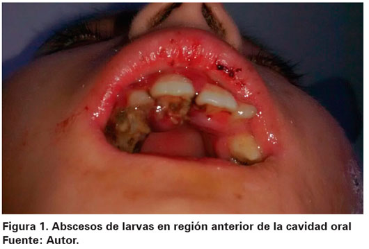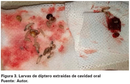 Se procede a realizar limpieza oral con solución salina normal, gasas, uso de vaselina como agente asfixiante en cada absceso y extracción de larvas con pinzas para un total de 30 parásitos, posteriormente se realiza retiro de dientes deciduos (Ver Figura 3) y se da salida con recomendaciones de uso de tapabocas, toldillo e higiene oral. Asiste a control a los tres días para continuación del tratamiento, se realizan iguales medidas de limpieza y se extraen dos larvas adultas, una pequeña y demás residuos de dientes temporales. Durante la tercera visita realizada a los ocho días, se comprueba la ausencia de larvas y se observa adecuada evolución de cicatrización e higiene oral. No se realizó identificación del agente etiológico, dada la limitación geográfica para el estudio y que este no es finalmente el objetivo de la presentación del caso.