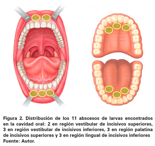 Paciente masculino de 14 años de edad, con antecedente de meningitis al año de nacimiento, con parálisis cerebral y síndrome convulsivo secundario, en tratamiento con ácido valpróico, quien es llevado al hospital de su municipio de residencia por un cuadro clínico de aproximadamente un día de evolución de rechazo a la vía oral asociado a hemorragia gingival en incisivos superiores. Al ingreso se encuentra paciente con parálisis motora generalizada, hidratado, tolerando dieta líquida, al examen bucal se destaca estado de salud oral deficiente, hiperplasia gingival medicamentosa y piezas dentales temporales en mal estado. Adicionalmente, se observan 11 abscesos de larvas distribuidos de la siguiente manera: dos en región vestibular de incisivos superiores, tres en región vestibular de incisivos inferiores, tres en región palatina de incisivos superiores y tres en región lingual de incisivos inferiores (Ver Figuras 1 y 2).
