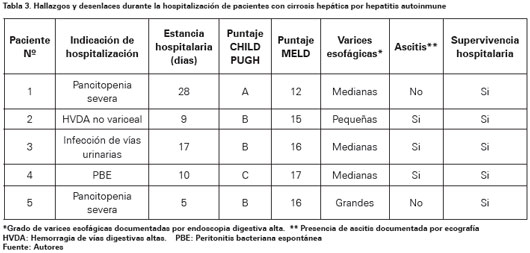 Con respecto a las pruebas de laboratorio, se encontró AST elevada en todos los casos (mediana: 74 U/L), ALT sobre límites normales en tres casos (mediana: 42 U/L), bilirrubina total elevada en cuatro pacientes (mediana: 1.7 mg/dl) e IgG anormal en dos pacientes (mediana: 1721 mg/dl). El puntaje de Child Pugh más frecuente fue B (60%), seguido por A y C en porcentajes iguales (20%), la mediana de puntaje MELD fue 16 y no hubo casos de muerte intrahospitalaria en esta serie.
