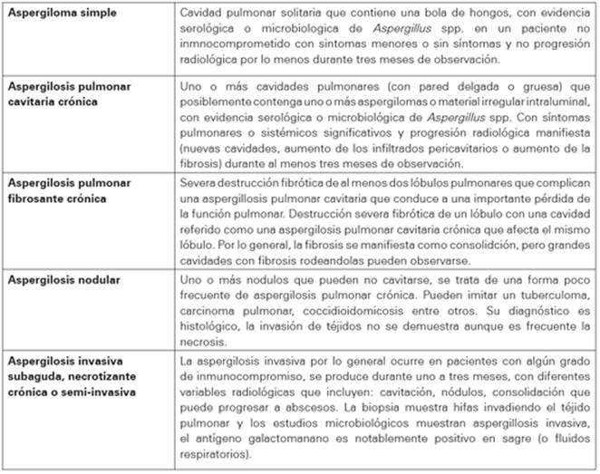 Tabla 1 Críterios diagnósticos para las diferentes formas de aspergillosis pulmonar crónica.