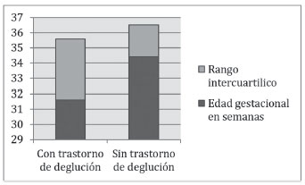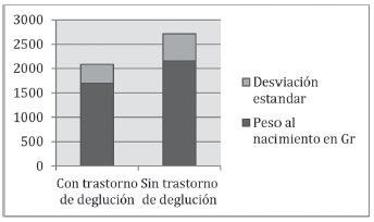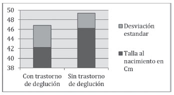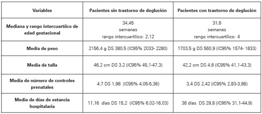 Los resultados del presente artículo no son la excepción a este comportamiento, la media de la edad gestacional al momento del nacimiento de los pacientes con trastorno de deglución fue mucho menor (31,71 semanas DS 2,56 (IC 95% 31,132,3)) comparada con la de los pacientes que no presentaron este trastorno (34,08 semanas DS 1,76 (IC 95% 33,5-34,6)); tendencia que se observó en otras variables como media del peso al momento del nacimiento de los pacientes que presentaban trastorno de deglución versus neonatos que no presentaban el diagnóstico ( 1703,53 g DS 560,9 (IC 95% 1574,4-1832,5) versus 2156g DS 380,5 (IC 95% 2033- 2279,8) respectivamente); así como en la media de la talla al momento del nacimiento ( 42,2 centímetros DS 4,6 (IC 95% 41,1- 43,3) versus 46,2 Centímetros DS 3,2 (IC 95% 45,1- 47,3) respectivamente). A su vez la media del número de controles prenatales realizados hasta el momento del nacimiento de los pacientes que presentaban trastorno de deglución fue menor con respecto a los que no presentaban el diagnóstico ( 3,4 controles DS 2,42 (IC 95% 2,83- 3,98) versus 4,7 controles DS 1,98 (IC 95% 4,05-5,36) respectivamente). En las variables anteriormente descritas, se encontró una relación estadísticamente significativa con el TSD como se puede evidenciar en la tabla 5.