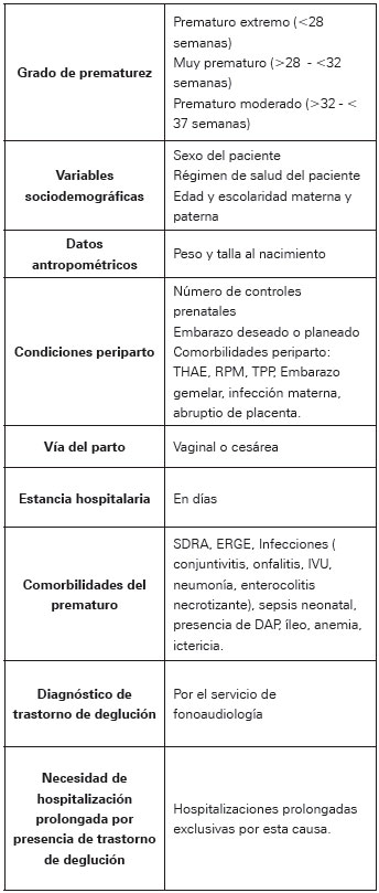 Como criterios de inclusión se tuvieron en cuenta pacientes con edad gestacional menor a 37 semanas al momento de nacer y como criterios de exclusión se tomaron malformaciones a nivel de cabeza y cuello, malformaciones del tracto digestivo como atresias, síndromes genéticos, hemorragias intracraneales, inestabilidad cardiovascular que impida la vía oral. Se obtuvo información de las historias clínicas que cumplían el criterio de inclusión y no presentaban ningún criterio de exclusión, las variables se pueden observar en la tabla 1.