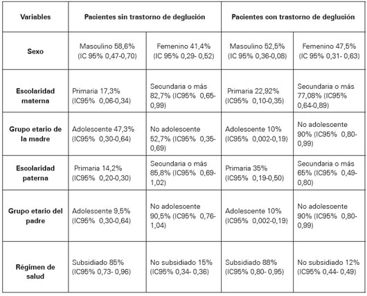 El sexo masculino predominó en los dos grupos así como la escolaridad por parte de los padres de secundaria o más; la mayoría de las madres y los padres de estos pacientes no eran adolescentes y un gran porcentaje de ambos grupos pertenecía al régimen subsidiado (Ver Tabla 2). La tabla número tres resume los hallazgos en cuanto porcentaje de las variables sociodemográficas tanto del grupo de prematuros que presentaron trastorno de deglución como los del grupo que no lo presentaron con sus respectivos intervalos de confianza.