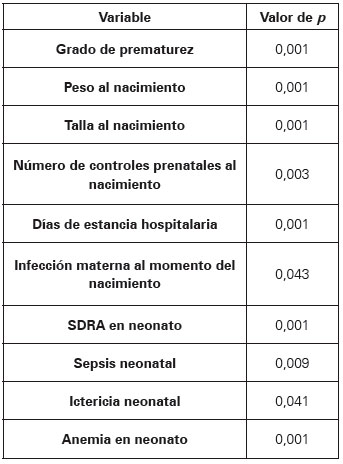 De las variables cuantitativas, las que en mayor porcentaje se encontraron en pacientes con TSD con respecto a los que no tienen este diagnóstico fueron, trastorno de Hipertensión Asociado al Embarazo (THAE) con un 28% versus 17,5%, infección materna al momento del parto con un 29,3% versus 12,5% abruptio de placentae con un 4% versus 0%, parto por cesárea con un 69,3% versus 52,5%, Síndrome de Dificultad Respiratoria Aguda (SDRA) con un 93,3% versus 67,5%, sepsis neonatal con un 47,3% versus 22,5%, ictericia neonatal con un 71,6% versus 52,5%, íleo con un 21,6% versus 12,5% y anemia con un 37,8% versus 5% (Ver Tabla 4).