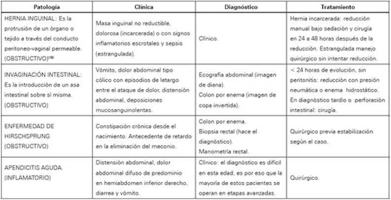 El principal tipo de abdomen agudo quirúrgico en el lactante sigue siendo el obstructivo congénito, pero ya no es completo sino parcial. Empieza a tomar un papel importante el abdomen agudo inflamatorio y el obstructivo adquirido. Las enfermedades que más se asocian a abdomen agudo en el lactante (Ver Tabla 1).