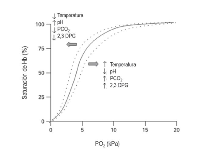 La relación entre la SaO2 y la PaO2 se ve afectada por la concentración de hidrogeniones (pH), la PaCO2, la temperatura y la concentración de 2,3-difosfoglicerato (DPG) en los hematíes; su interacción genera desplazamientos de la curva disociación de la hemoglobina hacia la derecha o izquierda (Ver Figura 1). La disminución del pH, el aumento de la PaCO2, el incremento de la temperatura y el aumento del DP6 desvían la curva hacia la derecha y los cambios opuestos desvían la curva hacia la izquierda. Una desviación hacia a la derecha disminuye la afinidad de la hemoglobina por el oxígeno lo que significa mayor facilidad de entrega de oxígeno para una determinada PaO2 a nivel tisular 11), (12.