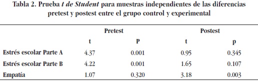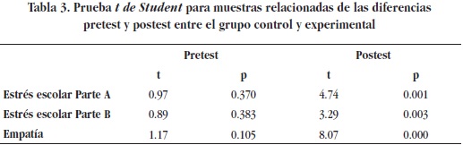 Al realizar el análisis estadístico de las diferencias entre las puntuaciones postestpretest en el grupo experimental, se obtuvo diferencias en las variables dependientes (estrés escolar y empatía), observándose un incremento de las puntuaciones medias postest en empatía y un decremento en el estrés escolar en comparación con las puntuaciones medias pretest. Por el contrario, no hubo diferencias en el grupo control entre las puntuaciones medias postest y pretest en ninguna de las variables dependientes.