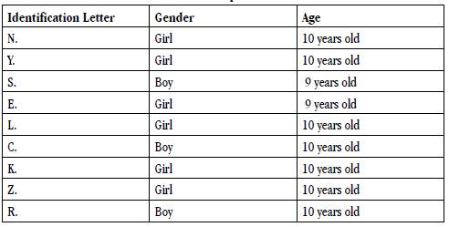 The ten children were chosen based on the answers provided by them in the first survey. They were who we identified hold little culture knowledge about other cultures and we could also evidence some misunderstanding or stereotypes in the answers they provided to the different questions. As a way to identify them, we decided to use letters as it is presented in the next table: