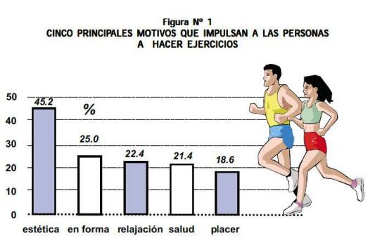 La estética corporal es la razón primordial que alienta a las personas en general a interesarse en el ejercicio (Tabla N° 1, Figura N° 1). Le siguen en su orden otras razones como la forma física, la relajación mental, la salud, el placer y por último la activación.