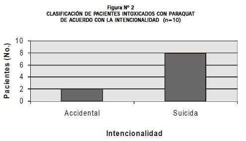 Fueron excluidos aquellos pacientes que ingresaron 10 días o más después de transcurrida la intoxicación, los que no tenían adecuadamente seguido el protocolo de tratamiento, quienes presentaron reacciones alérgicas o de hipersensibilidad a cualquiera de los fármacos utilizados y los que no tenían reporte de los niveles plasmáticos de paraquat. 8 de los 10 pacientes aceptados ingirieron el tóxico voluntariamente con fines suicidas, los otros dos lo tomaron ignorando el contenido del recipiente (un paciente ebrio y un niño) (Figura Nº 2).