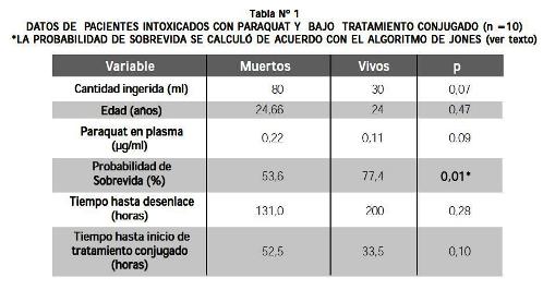 Se encuentra una diferencia estadística significativa en cuanto a los valores de concentración plasmática de paraquat entre los pacientes que sobrevivieron y los que fallecieron, siendo mucho más altas las concentraciones para estos últimos. Dos pacientes clasificados uno como leve y otro como moderado, con respecto a la clínica presentaron iguales concentraciones plasmáticas. Al aplicar los cálculos de regresión logística se observó que el índice de probabilidad de sobrevida fue mayor para los pacientes que sobrevivieron con una diferencia significativa para un valor de p de 0.01 corroborando que este índice es un buen predictor del desenlace. En los pacientes severamente intoxicados, el compromiso multiorgánico hace que su pronóstico sea reservado independientemente del tratamiento instaurado. El hecho de que la mayoría de las investigaciones consultadas reportan una alta mortalidad, con porcentajes que oscilan entre 74 y 80% (Botella de Maglia, 2000 (18); Bismuth, C 1990 (19); Fairshter, R. 1976 (20) sugiere que nuestro tratamiento es útil, dado que la mortalidad en nuestro estudio fue del 60% (entre un 14 y un 60% menor).