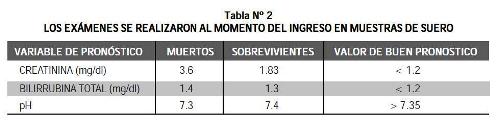 Se sabe que el paraquat es un tóxico que afecta principalmente las funciones pulmonar, hepática y renal. Se encontró una tendencia a la elevación en los valores de BUN, creatinina, ALT, BT, BD, en los pacientes que fallecieron comparados con los que sobrevivieron, y una diferencia estadísticamente significativa en los valores de AST. En nuestro estudio el examen de laboratorio que más se correlacionó con la mortalidad, fue la concentración de creatinina sérica con un valor promedio de 1,83 mg/dl para los que sobrevivieron y de 3,6 mg/dl para los que fallecieron. En los informes de la literatura (18,19,20), una creatinina sérica de 1,2 mg/dl es un índice de buen pronóstico.