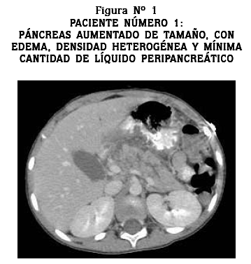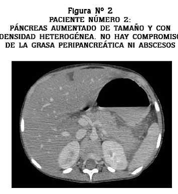 Evolucionó satisfactoriamente y 21 días después del accidente (julio 17 de 2006) se le iniciaron procedimientos quirúrgicos reconstructivos con desbridamiento e injertos, que toleró bien. Doce días después (julio 29 de 2006) comenzó a presentar episodios postprandiales repetidos de náuseas y vómito, en vista de lo cual se le hicieron exámenes paraclínicos que dieron los siguientes resultados: amilasas séricas 455 U/L (rango normal: 30-110) y amilasas urinarias 4.438 U/L (rango normal: 32-64). Ante la sospecha de pancreatitis aguda fue evaluado por un miembro del servicio de Pediatría (3 de agosto de 2006) y trasladado a la Unidad de Cuidados Especiales. El mismo día se le hizo tomografía simple y contrastada de abdomen que reveló "páncreas aumentado de tamaño en forma difusa, con cambios inflamatorios peripancreáticos y engrosamiento de la fascia pararrenal anterior; no hay líquido libre. Correlacionar estos hallazgos con pancreatitis tipo Balthazar B" (Figura 2).