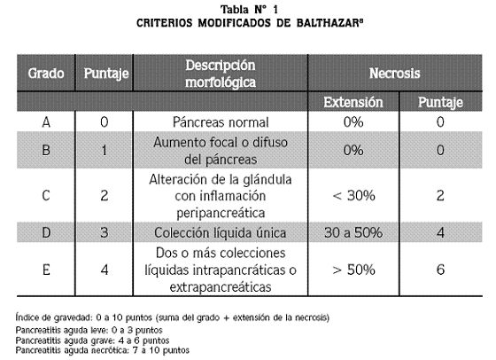 La tomografía, simple o contrastada, tiene mayor utilidad para la clasificación de la enfermedad, con mejor rendimiento entre el tercero y décimo días de evolución; permite descartar o confirmar la presencia de colecciones y evaluar la existencia, localización y extensión de la necrosis. Además proporciona los criterios de Balthazar modificados8 que establecen la gravedad del proceso (Tabla Nº 1). Los criterios de Ranson y Glasgow utilizados en los adultos6 tienen poco valor para predecir la gravedad de la pancreatitis en niños.
