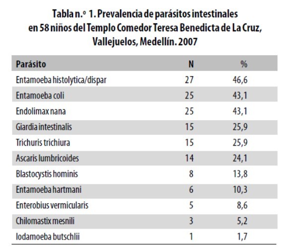Intestinal parasites prevalence in children from"Templo– Comedor Sagrado Corazón Teresa Benedicta de la Cruz", Vallejuelos–Medellín, 2007.