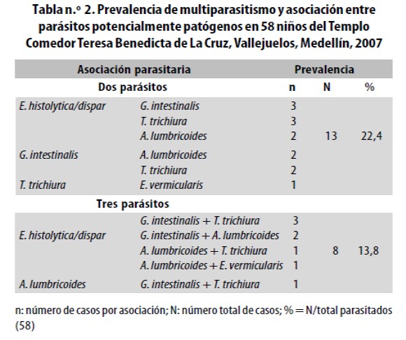 La tasas de prevalencia de los parásitos intestinales hallados en los 58 niños se presentan en la tabla n.° 1. Entre los parásitos potencialmente patógenos predominó Entamoeba histolytica/dispar (46,6%), seguida en orden descendente por Giardia intestinalis (25,9%), Trichuris trichiura (25,9%), Ascaris lumbricoides (24,1%) y Enterobius vermicularis (8,6%). Se hallaron los siguientes comensales: Entamoeba coli (43,1%), Endolimax nana (43,1%), Entamoeba hartmani (10,3%), Chilomastix mesnili (5,2%) y Iodamoeba butschlii (1,7%). No se presentaron casos de uncinariasis ni de estrongiloidiasis. En 21 niños (36,2%) se halló multiparasitismo (tabla n.° 2); de ellos, trece tenían dos parásitos y los otros ocho estaban infectados con tres parásitos; se halló Entamoeba histolytica/dispar asociada con otro parásito en ocho niños y con otros dos parásitos en siete más, o sea, que de los 21 niños multiparasitados en 15 uno de los parásitos era E. histolytica/dispar.
