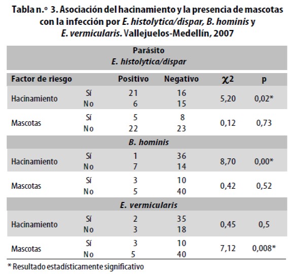 Al explorar la relación entre la prevalencia de parásitos intestinales y algunos factores sociodemográficos de riesgo, solo se encontró asociación significativa entre la tenencia de mascotas y la presencia de E. vermicularis (?2 = 7,12, p = 0,008). Además se encontró asociación entre el hacinamiento y la probabilidad de adquirir la infección por E. histolytica/dispar y B. hominis, ?2 = 5,2, p = 0,02 y ?2 = 8,7, p = 0,00, respectivamente, pero no para E. vermicularis ni otras especies parasitarias (Tabla n.° 3).