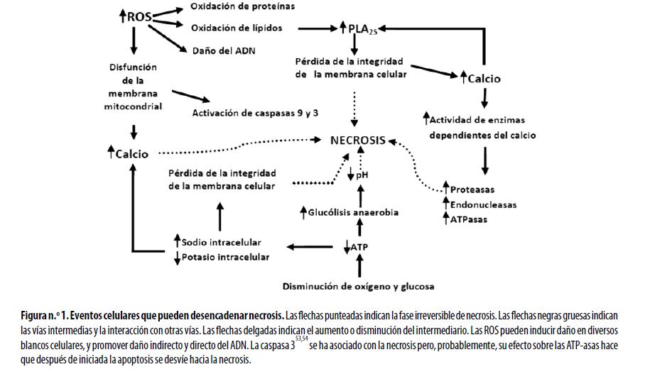 Se ha entendido la necrosis como una muerte celular no controlada que promueve reacciones inflamatorias en los tejidos circundantes y puede favorecer la diseminación de patógenos en un hospedero susceptible. Diferentes estudios la replantean como un fenómeno 'esencial y anunciado', muestran que ocurre durante la ontogenia y que puede ser regulada por vías que no son tan entendibles como las de la apoptosis. Se ha descrito la necrosis inducida por deficiencias de ATP en la isquemia y cuando hay alteraciones de las funciones dependientes de oxígeno y del ciclo de los ácidos tricarboxílicos.8 Las células bajo condiciones de anoxia quedan a expensas del suministro de energía a partir de la glicólisis, si es viable, y de la degradación de sustratos endógenos con mínimo consumo de ATP y de oxígeno.8 Esto reduce la actividad de la cadena transportadora de electrones y el pH intracelular, lo que generalmente está asociado a la acumulación de ácido láctico y a alteraciones en las bombas de hidrogeniones, desensamble de ribosomas y cese de la síntesis de proteínas.4,8,10