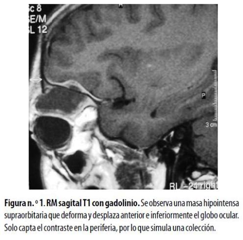 Niña de 6 años, residente en zona rural, llevada a la consulta porque presentaba proptosis progresiva derecha. No refería alteración visual ni otros síntomas de importancia. El desarrollo psicomotor era normal para la edad. Con la sospecha clínica de una masa retrocular, se le hizo una TC de órbitas que mostró una imagen con densidad de tejidos blandos localizada en el techo de la órbita con extensión al espacio retrocular; la lesión afectaba el músculo recto superior pero no invadía el globo ocular, ni el nervio óptico ni las superficies óseas. Ante la necesidad de caracterizar mejor el alcance de la lesión en los tejidos blandos se hizo una RM que reveló una lesión hipointensa con estos en las imágenes sopesadas en T1, con realce anular después de la administración de gadolinio (figura nº. 1) e hipointensidad en las secuencias ponderadas en T2 que evidenció un alto contenido celular. La biopsia demostró un sarcoma granulocítico. Como no existían antecedentes ni sospecha de leucemia, se le hicieron estudios complementarios de médula ósea y sangre periférica que evidenciaron una LMA como enfermedad de base.