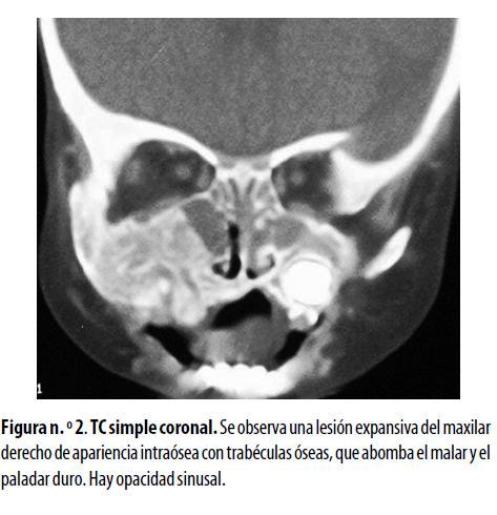 La TC de los senos paranasales mostró una lesión mixta de tejido blando con trabéculas óseas engrosadas, ligeramente expansiva, que afectaba el malar y el maxilar derechos y el paladar duro, pero sin destrucción ósea. Había contacto íntimo con las raíces dentarias pero no lesión subcutánea. Se observó engrosamiento de la mucosa de los senos maxilares y las celdillas etmoidales estaban ocupadas por material con densidad de tejido blando. Se observó también aumento bilateral de los tejidos blandos intranasales (figura n.º 2) . En una biopsia inicial del maxilar derecho se diagnosticó linfoma de Burkitt; se inició quimioterapia pero la respuesta fue mala; requirió varias hospitalizaciones por cuadros de agranulocitosis y síndromes febriles. Otro estudio histopatológico mostró múltiples espículas óseas con áreas necróticas y algunos fragmentos de tejido blando como músculo y tejido conectivo. El estudio inmunohistoquímico reveló la existencia de un SG. Se cambió el esquema de quimioterapia, lo que fue seguido de franca mejoría clínica y disminución del tamaño de la lesión.