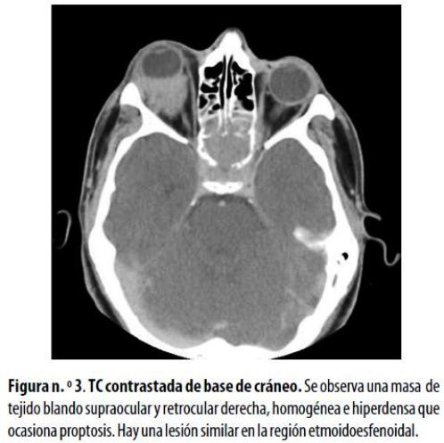 Hombre de 18 años en recaída de LMA, quien consultó por dolor orbitario y proptosis derecha. La TC mostró una masa homogénea de tejido blando supraocular y retrocular en la órbita derecha, que ocasionaba la proptosis, y lesión erosiva en la región esfenoetmoidal (figura n.º 3) . En vista de la progresión de sus síntomas visuales fue sometido a radioterapia con buena tolerancia; sin embargo, no se describieron los controles clínicos adicionales después de la terapia.