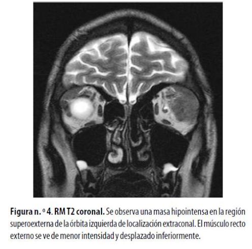 Rabdomiosarcoma: es el tumor maligno orbitario más frecuente en la primera década de la vida y constituye el 5% de todos los cánceres de la infancia. Su origen es mesenquimal. El subtipo más frecuente es el embrionario. Es agresivo y de crecimiento rápido. Se caracteriza por una masa orbitaria pero es raro que afecte el globo ocular. Más frecuentemente es extraconal, postseptal y superonasal. Puede ocasionar erosión ósea. Usualmente tiene mayor contenido de agua que el SG lo que se manifiesta como lesiones hiperintensas en las secuencias T2 de la RM.15