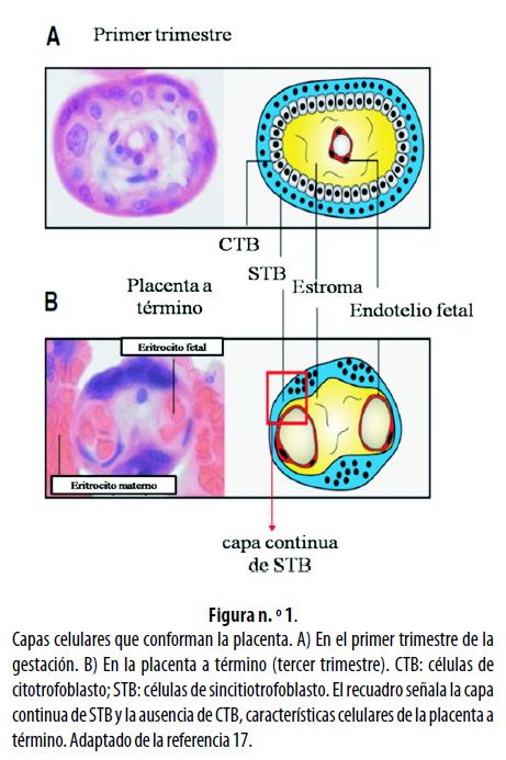 La placenta está formada por diferentes capas celulares que separan la circulación fetal de la materna, formando dos espacios bien delimitados; el primero es el espacio intervelloso, que comprende la circulación materna, y el segundo, el espacio vascular velloso del feto.16 La superficie de las vellosidades está cubierta por células de trofoblasto (llamadas sincitiotrofoblasto) ancladas a una lámina basal; en el primer trimestre el trofoblasto está constituido por una capa interna de células de citotrofoblasto mononucleadas, que se diferencian y fusionan para formar la capa externa ininterrumpida del sincitiotrofoblasto.17 La figura n.° 1 muestra las capas celulares que conforman la placenta y el cambio que sufren entre el primer y tercer trimestres de la gestación.