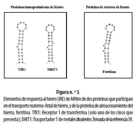 La síntesis de las proteínas que participan en el transporte, el almacenamiento y la utilización de hierro se controla de forma coordinada después de la transcripción, por el contenido de hierro intracelular. La regulación depende de la interacción entre las proteínas citoplasmáticas denominadas IRP (por la sigla en inglés de Iron Regulating Proteins), que actúan como sensores del hierro, y los IRE que son estructuras en forma de tallo o asa de 26 a 30 nucleótidos, ubicadas en las moléculas de ARNm. La figura n.° 3 esquematiza los IRE del Receptor 1 de la transferrina y del Transportador 1 de metales divalentes, que participan en el transporte materno-fetal de hierro, y de la ferritina, responsable de su almacenamiento. 31,39