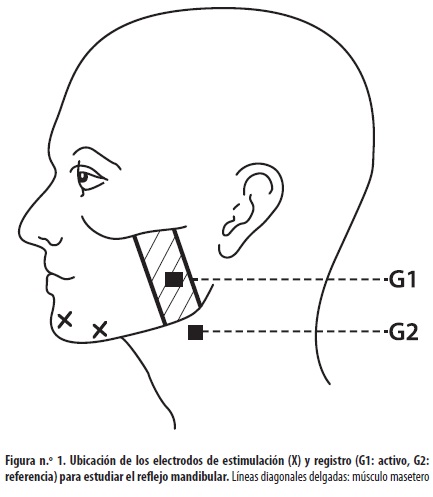Cuando el examinador golpea la mandíbula del sujeto con un martillo conectado a un microinterruptor, este dispara el osciloscopio del electromiógrafo. Las respuestas neuromusculares sencillas o únicas se registran simultáneamente en los dos lados de la cara con electrodos de superficie. El electrodo activo se pone en el tercio inferior del músculo masetero, entre el zigoma y el borde inferior de la mandíbula; el electrodo de referencia se pone por debajo del ángulo mandibular, y el llamado electrodo de tierra se pone en la frente, en la nuca o en el brazo (11-16) (figura n.º 1). El golpe del martillo se debe aplicar en la mandíbula a intervalos de 10 segundos o más. Cabe recordar que el estado dental, la fuerza con que se hace la oclusión dental y la posición de la mandíbula afectan estas respuestas reflejas (17-19). En individuos obesos, a veces, es difícil obtener el reflejo con electrodos de superficie, por lo que se hace necesario utilizar electrodos de aguja (15). La amplitud del RM disminuye con la edad y es menor en hombres que en mujeres (19,20).