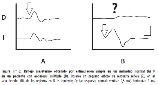 El RM obtenido con estímulo sencillo es útil para evaluar neuropatías craneales (13-15). La anormalidad más común es la ausencia del RM, más las que alteraciones de su latencia, la cual se encuentra prolongada en enfermedades desmielinizantes como la esclerosis múltiple (12,15). Diversos factores pueden modificar este reflejo, pero un retardo unilateral inequívoco, o su ausencia, sugiere una lesión de la rama motora del nervio trigémino o de sus centros integradores en el tallo cerebral; cuando esta alteración se asocia con una respuesta anormal del RP, principalmente la primera respuesta llamada R1, sugiere una lesión pontina rostral (6,11,15,17).