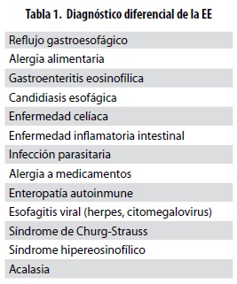 Entre los diagnósticos diferenciales, es de particular importancia la distinción entre la EE y la ERGE, para lo cual se pueden tener en cuenta algunos puntos clave: 1. En la ERGE el infiltrado de eosinófilos y los síntomas suelen mejorar con el tratamiento de supresión ácida (46,52), lo que no ocurre en la EE, a excepción de un subgrupo de pacientes con EE que responden a IBP (1). 2. La EE suele afectar a hombres jóvenes con disfagia, en la gran mayoría con antecedentes de alergias o atopia y con anormalidades esofágicas en la endoscopia digestiva superior y es menos probable la presencia de hernia hiatal, que apoya más el diagnóstico de ERGE (53,54). 3. A mayor número de eosinófilos en el tejido se sugiere una causa no ácida, especialmente si el infiltrado es en el esófago proximal (4,48) y se encuentra en varias biopsias tomadas a diferentes niveles (52). 4. Otros hallazgos histológicos como el compromiso subepitelial y la fibrosis de la lámina propia, la hiperplasia y la presencia de abscesos eosinofílicos están a favor del diagnóstico de EE (48). 5. La medición del nivel de eotaxina 3 en las muestras de biopsia, por inmunohistoquímica o reacción en cadena de la polimerasa, se ha sugerido como un parámetro útil para diferenciar la EE de la ERGE (55,56).