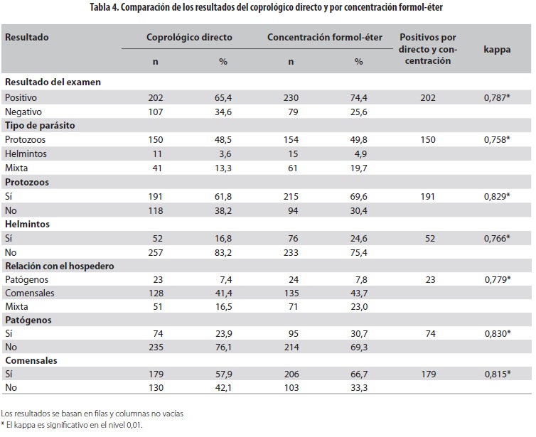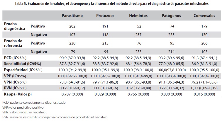 Resultados: la frecuencia global de parásitos, según el examen por concentración, fue 74,4%; la evaluación se hizo para parasitismo general y para las categorías protozoos, helmintos, comensales y patógenos; se hallaron sensibilidad superior al 68%, especificidad y valor predictivo positivo del 100%, valor predictivo negativo mayor de 74%, razón de verosimilitud negativa menor de 0,32, kappa superior a 0,77 y eficiencia superior al 90%.