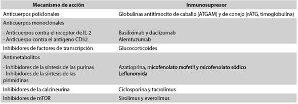 El mayor riesgo de rechazo del órgano trasplantado ocurre en las primeras semanas o meses después del trasplante; pasado este período, el riesgo es intermedio durante el primer año del trasplante y posteriormente baja, pero queda latente el resto de la vida6. Existen dos estrategias para disminuir este riesgo: la primera consiste en suministrar altas dosis de los inmunosupresores convencionales; la segunda se basa en la utilización de anticuerpos monoclonales o policlonales contra antígenos de los linfocitos T. La decisión de utilizar dichos anticuerpos depende del órgano que se va a trasplantar, del riesgo inmunológico del receptor y de si se van a utilizar bajas dosis de inmunosupresores en la terapia de mantenimiento6. Los anticuerpos policlonales más utilizados son las globulinas antitimocito de caballo (ATGAM) y de conejo (rATG). Los anticuerpos monoclonales más usados son aquellos contra el receptor de IL-2 (basiliximab y daclizumab) y el dirigido contra el antígeno CD52 (alemtuzumab). En Colombia se cuenta con ATGAM, rATG y basiliximab, pero no con daclizumab y alemtuzumab.