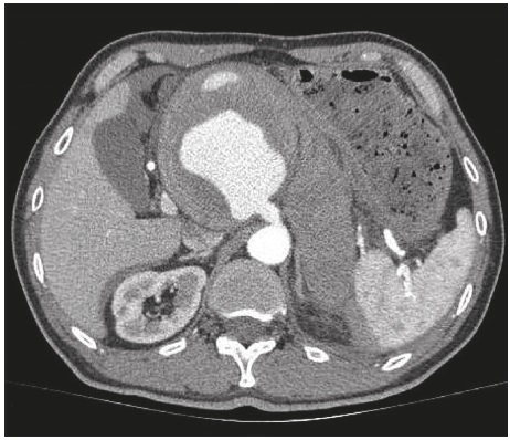 Figura 1 Tomografia axial computarizada (TAC). Se observan disección aneurismática del tronco celíaco de 10 mm de diámetro con un trombo mural, y un gran hematoma a nivel del citado aneurisma así como un hematoma localizado en la parte posterior del riñón izquierdo que progresa hacia la fascia generando un hematoma periesplénico, perihepático y peripancreático
