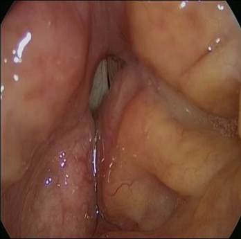 Caso 1. Se realizó una estroboscopia con evidencia de infiltración submucosa de color amarillo, asimetría en hemilaringe izquierda con predominio en la banda ventricular y repliegue ariepiglótico asociado con una obstrucción de la vía aérea (Figura 1).