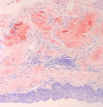 Caso 3. Se realizó una toma de biopsia con resultado positivo para el depósito de amiloide. Fue valorada por reumatología que consideró el compromiso concomitante en la piel, por lo que se inició el manejo farmacológico sistémico.