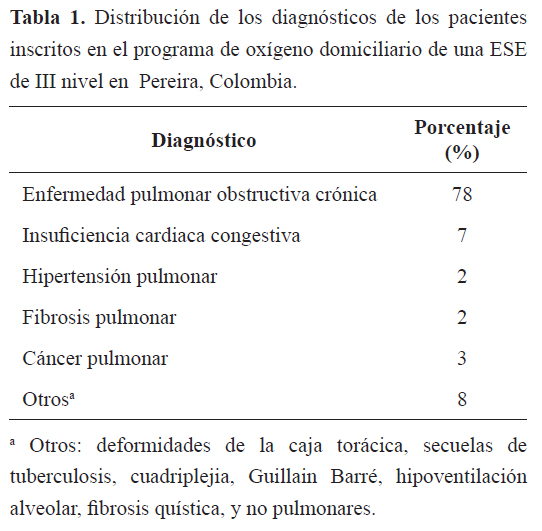 Durante un año se siguieron todos los pacientes inscritos en el programa de oxígeno domiciliario de una Empresa Social del Estado (ESE) estatal con los 3 primeros niveles de complejidad en Pereira, Colombia. Los criterios para iniciar la terapia de oxígeno a largo plazo fueron: tener PaO2 < 55 mmHg durante un periodo de estabilidad clínica y con tratamiento farmacológico optimo o PaO2 entre 56-59 mmHg asociado a hipertensión pulmonar, cor pulmonar, policitemia secundaria (hematocrito > 55%). Los sistemas para la administración de oxigeno fueron: gas comprimido en cilindro de 6 metros cúbicos y concentrador, ningún paciente recibió oxígeno líquido y se consideró dosis efectiva el uso del oxígeno por 15 horas/día.