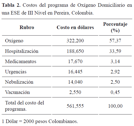 Todos los pacientes fueron seguidos por un médico neumólogo, quien fue el encargado de la recolección de todos los datos del estudio. Las variables medidas fueron: características sociodemográficas, antecedente de exposición a tabaco y a humo de leña, diagnóstico, vacunación, medicamentos recibidos, gasometría arterial, curva de flujo volumen, consumo de oxígeno, número de consultas a urgencias, número de hospitalizaciones, días de estancia hospitalaria y sobrevida. Para calcular los costos de la vacunación y los medicamentos se tomaron los valores comerciales y para los costos del sistema de entrega de oxígeno, se tomó el valor pagado por el alquiler del concentrador y del cilindro por mes y número de cilindros utilizados durante el mes, con el número de cilindros al mes, se calculo la utilización promedio de horas al día. Para el cálculo de los costos de las consultas de urgencias y los días de hospitalización se tomo el valor promedio institucional de 55 dólares para las consultas de urgencias y 110 dólares por día de hospitalización. Los costos se expresan en dólares americanos (2000 pesos colombianos = 1 dólar).