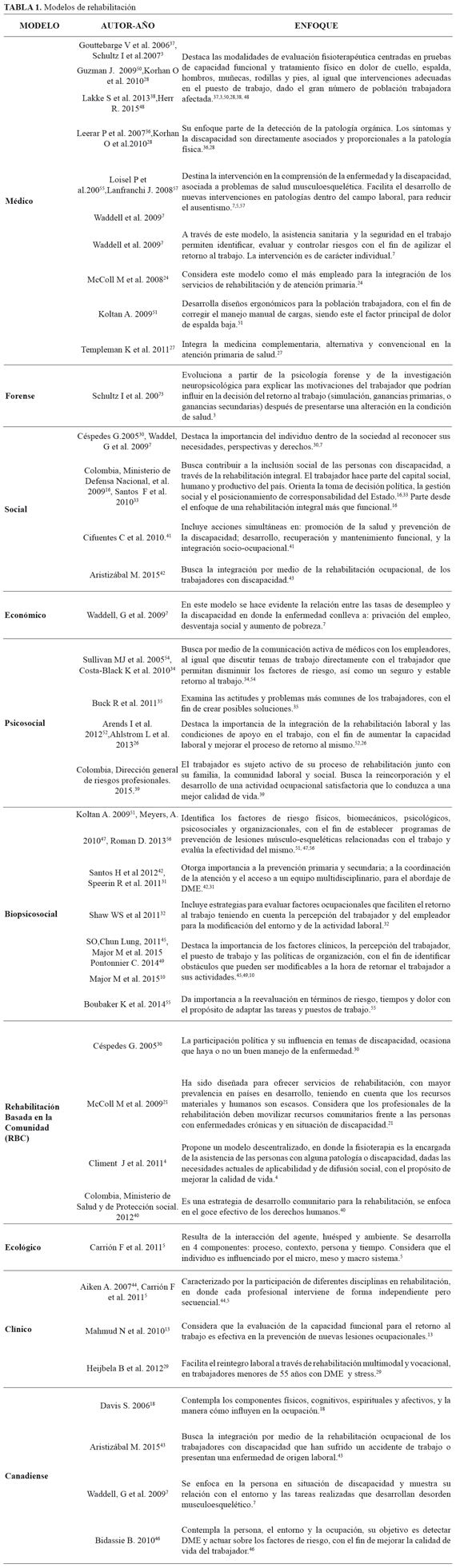 Forma de citar: Trillos MC, Tolosa IA, Escobar RY. Modelos de rehabilitación para la intervención del desorden músculoesquelético en trabajadores. Rev Univ Ind Santander Salud. 2016; (4): 536-547.