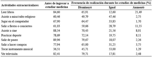 Se observó que en el aspecto de actividades extracurriculares antes y después del ingreso al plan de estudios de medicina en la UIS, ocurre un cambio significativo y prefieren no participar en ellas muy probablemente debido a que las actividades académicas ocupan la mayoría del tiempo, sacrificando el esparcimiento. Sin embargo el tocar algún instrumento musical o asistir a culto religioso, son las actividades que menos se afectan al estudiar medicina, probablemente debido a que la convicción religiosa y el don musical, cuando son verdaderos y forman parte de la identidad de la persona, se convierten en irrenunciables.