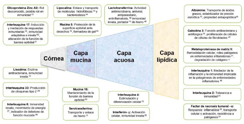 Actualmente, persiste la dificultad para diagnosticar y controlar pacientes con el síndrome de ojo seco debido a la variabilidad de los síntomas, ausencia de pruebas altamente confiables, débiles correlaciones entre pruebas clínicas y, por tanto, afectación en la calidad de vida de los pacientes 17, por ende, se hace evidente el valor clínico de desarrollar biomarcadores específicos para el diagnóstico. Incluso, se ha demostrado que la lagrima tiene una compleja composición de proteínas, lípidos, mucinas, agua y sales, de las cuales han sido identificadas 1526 proteínas gracias a los análisis proteómicos, éstas se consideran menos complejas que el fluido plasmático o suero 20. Por lo tanto, los biomarcadores son indicadores vitales que permiten el estudio de la actividad de la enfermedad y la toma de decisiones.