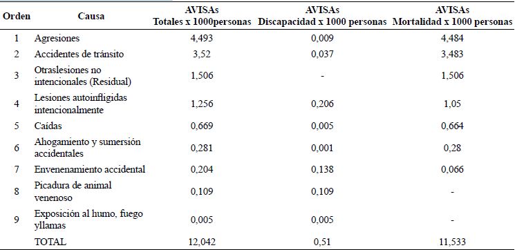 La carga global de enfermedad en la ciudad de Bucara-manga durante el año 2017 por causas externas se estimó en 12,04 AVISAS totales por cada 1000 habitantes, 0,51 AVISAS atribuible a discapacidad y 11,53 AVISAS de mortalidad por 1000 habitantes; las dos principales causas externas con mayor número de AVISAS son agresiones y accidentes de tránsito (véase Tabla 1).