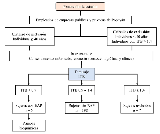 Estudio analítico observacional de tipo transversal que se realizó durante 9 meses, comprendidos entre julio del año 2021 y abril 2022, a partir de una muestra de trabajadores laboralmente activos de la ciudad de Popayán. Se consideró un promedio de prevalencia esperado del 2 %, un intervalo de confianza (IC) del 99 % de dos colas, una precisión del 1 % y se calculó un tamaño mínimo de 200 sujetos mayores de 40 años10. Se tuvieron como criterios de inclusión una edad ≥ 40 años, tener un contrato laboral con diferentes empresas participantes (públicas y privadas) y haber firmado el consentimiento informado. Y como criterios de exclusión, edad menor a 40 años y presentar un índice tobillo brazo (ITB) > 1,4 (Figura 1).