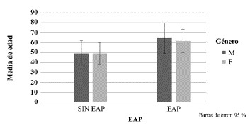 Figura 2 Diferencia de edad entre individuos sin EAP vs EAP por género. Se observa que la EAP es predominante en las personas con edades superiores a 60 años